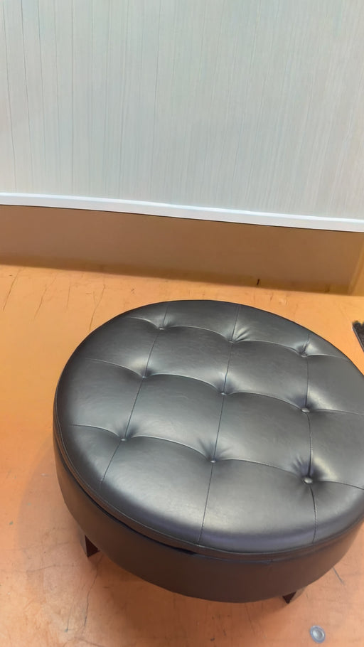 Low stockA surprisingly decorative round shape sets this ottoman apart from linear designs. Rich dark brown leatherette delivers a sleek, bold wrap over a ...